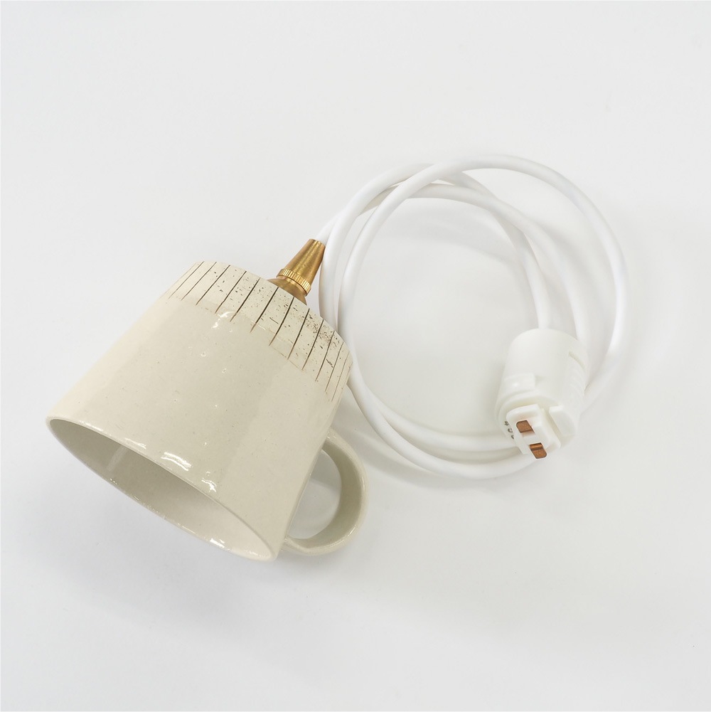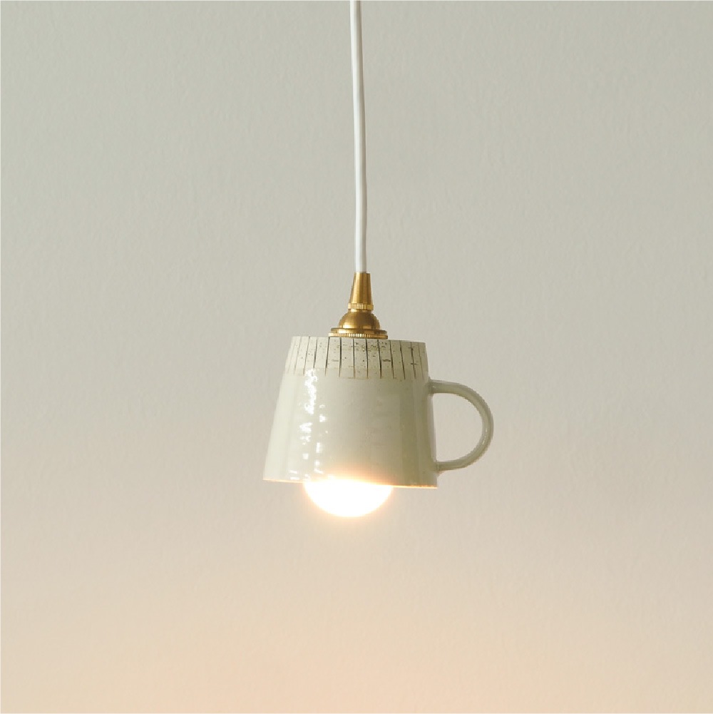カラフルな手作りの陶器カップをシェードにしたペンダントライト。